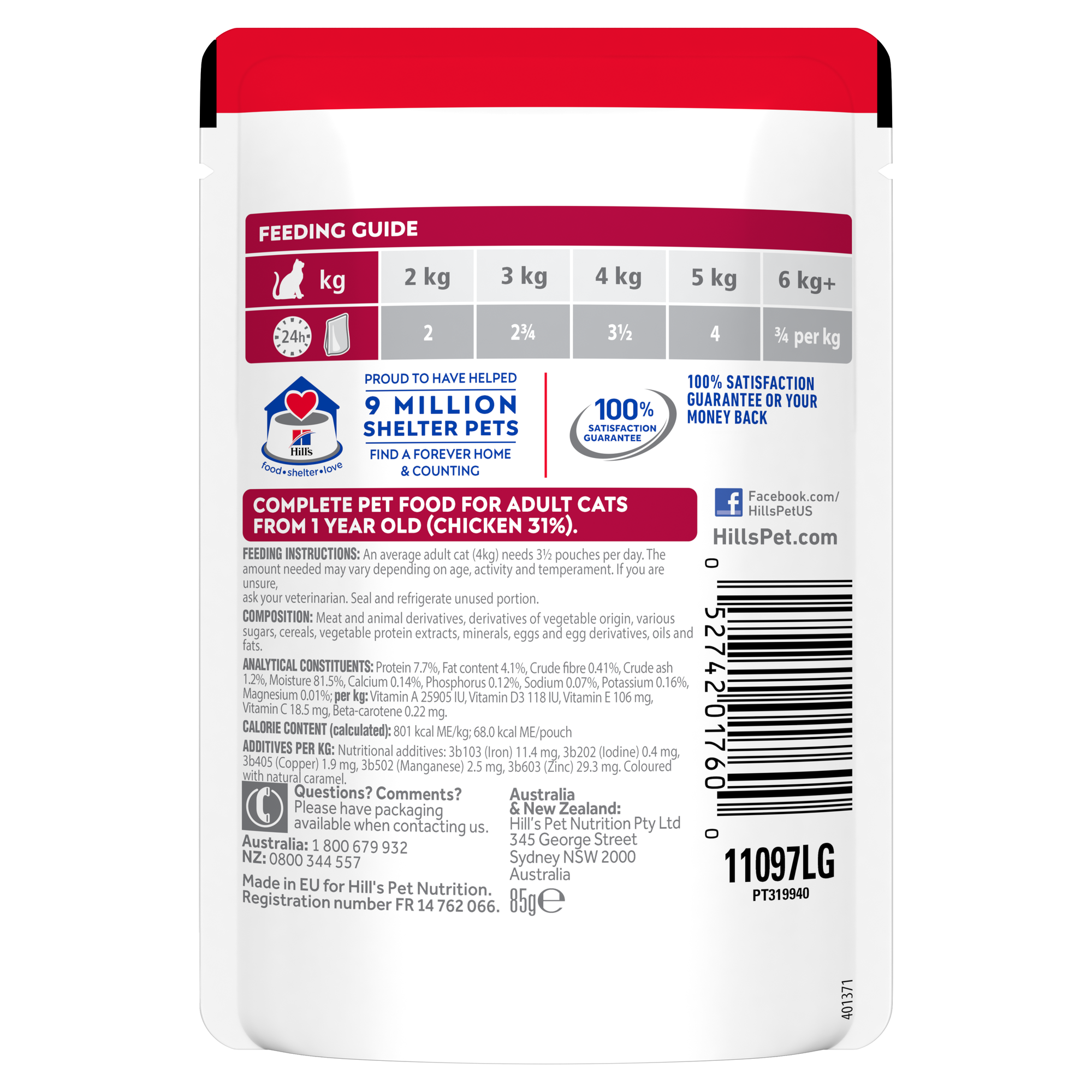 Your cat will love the taste ofHill's Science Diet Adult Chickenwet cat food tender chunks in gravy. It has the perfect balance of taste and nutrition and is specially formulated to fuel the energy needs of cats during the prime of their life. Serve this gourmet daily nutrition as a balanced meal by itself, or try it on top of Science Diet adult dry cat food.