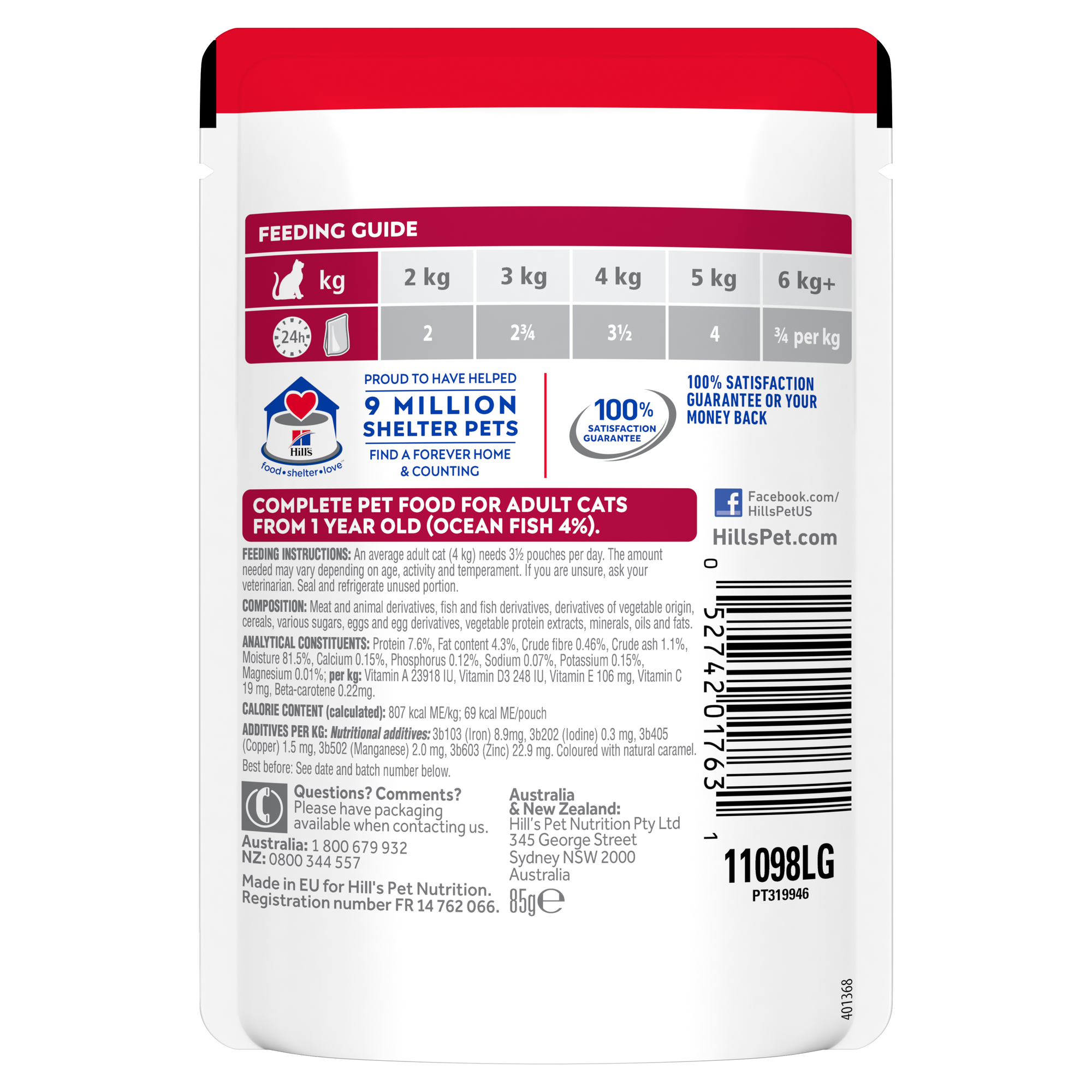 Your cat will love the taste ofHill's Science Diet Adult Ocean Fishwet cat food tender chunks in gravy. It has the perfect balance of taste and nutrition and is specially formulated to fuel the energy needs of cats during the prime of their life. Serve this gourmet daily nutrition as a balanced meal by itself, or try it on top of Science Diet adult dry cat food.