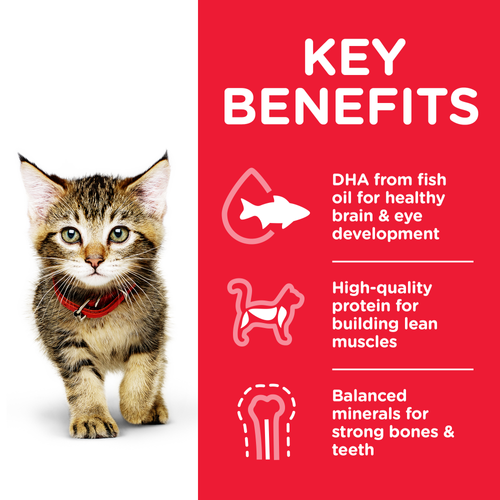 Kittens need the right amount of different nutrients for healthy development. These nutrients must be precisely balanced, because too much can be as harmful as too little. It is also important to use high quality ingredients to help digestion, which is particularly sensitive at this lifestage. Hill's Science Diet provides precisely balanced nutrition to address your kitten's individual needs, avoiding any deficiency or excess of nutrients.