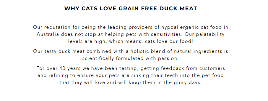 Our single meat duck protein meets the gold standard in holistic pet care. We ensure your cat gets the nutrition It needs by using only pure, all-natural Ingredients, with no meat by-products.