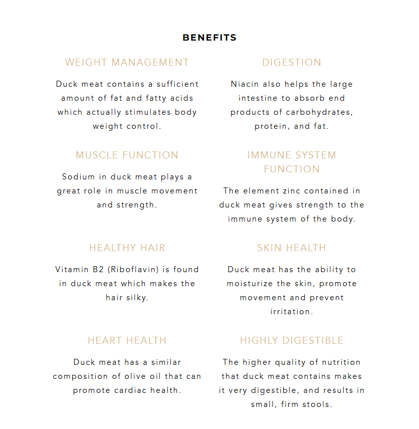 The higher quality of nutrition that duck meat contains makes it very digestible, and results in small, firm stools.