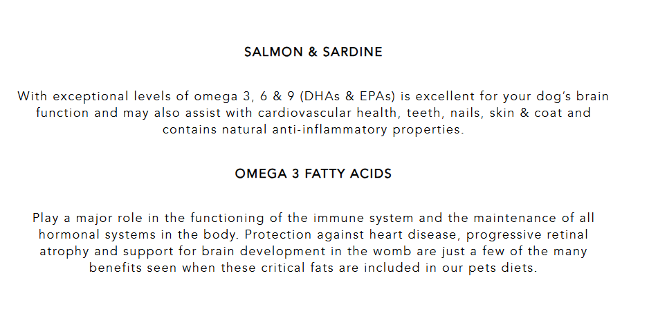 Exceptional levels of omega 3,6 & 9 (DHAs & EPAs) is excellent for your dog's brain function and may also assist with cardiovascular health, teeth, nails, skin & coat and contains natural anti-inflammatory properties.